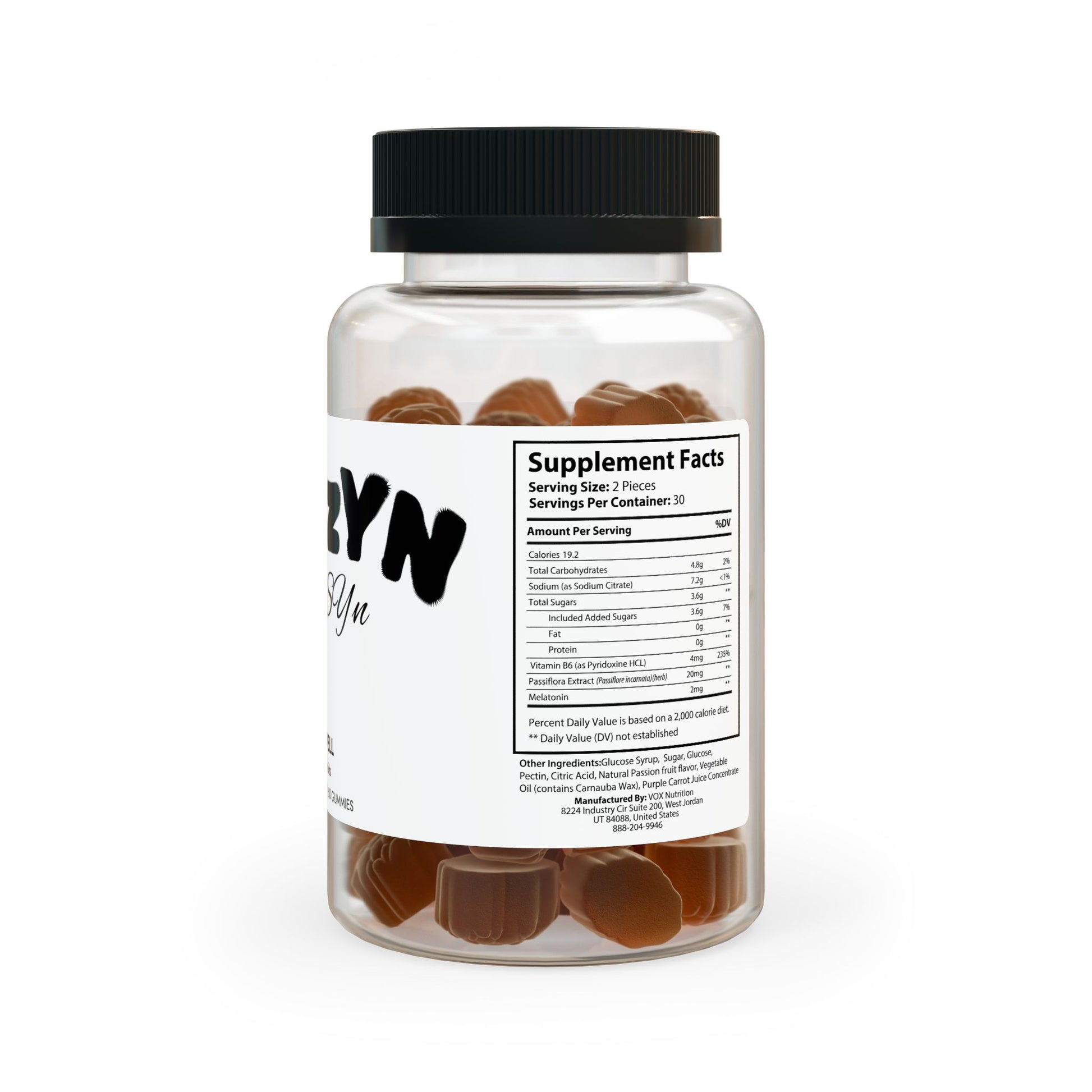Ingredients: Sodium (as Sodium Citrate), Vitamin B6 (as Pyridoxine HCL), Passiora Extract (Passiore incarnata)(herb), Melatonin. Other Ingredients: Glucose Syrup, Sugar, Glucose, Pectin, Citric Acid, Natural Passion fruit avor, Vegetable Oil (contains Carnauba Wax), Purple Carrot Juice Concentrate
